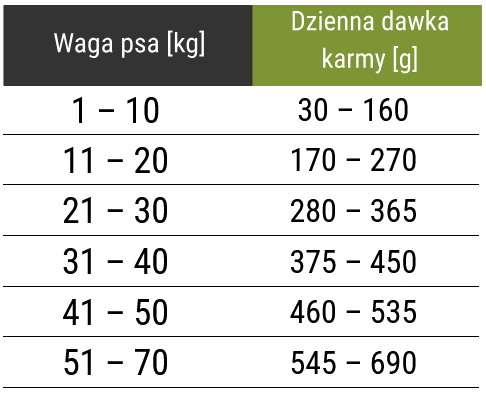 Podane ilości karmy są ilościami szacunkowymi opartymi na wieloletnich doświadczeniach praktycznych. Różne psy mogą mieć różną przemianę materii, dlatego ilość karmy należy dopasować indywidualnie dla każdego psa.