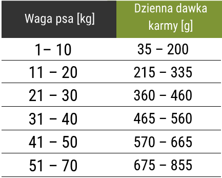 W każdej rasie psów znajdują się osobniki o różnej przemianie materii, dlatego ilość karmy należy dopasować indywidualnie dla każdego psa.