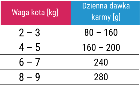 Podane ilości karmy są ilościami szacunkowymi opartymi na wieloletnich doświadczeniach praktycznych. W każdej rasie znajdują się osobniki o różnej przemianie materii, dlatego ilość karmy należy dopasować indywidualnie dla każdego zwierzęcia.