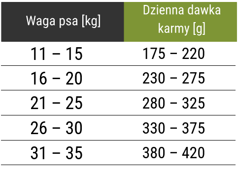 Podane ilości karmy są ilościami szacunkowymi opartymi na wieloletnich doświadczeniach praktycznych. W każdej rasie psów znajdują się osobniki o różnej przemianie materii, dlatego ilość karmy należy dopasować indywidualnie dla każdego psa.