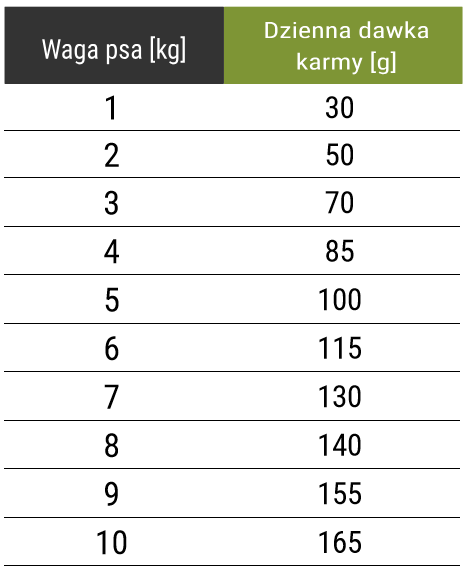 W każdej rasie psów znajdują się osobniki o różnej przemianie materii, dlatego ilość karmy należy dopasować indywidualnie dla każdego psa.