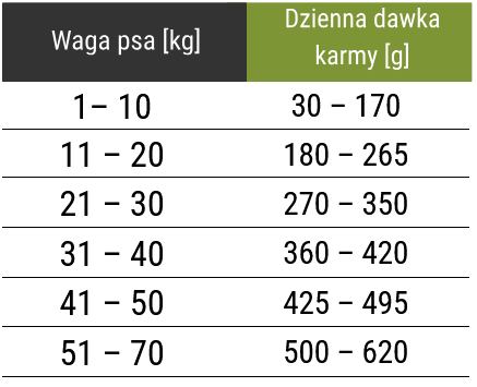Podane ilości karmy są ilościami szacunkowymi opartymi na wieloletnich doświadczeniach praktycznych. W każdej rasie psów znajdują się osobniki o różnej przemianie materii, dlatego ilość karmy należy dopasować indywidualnie dla każdego psa.